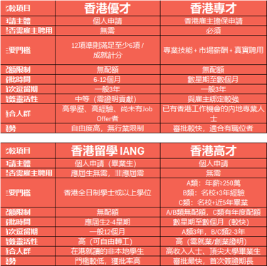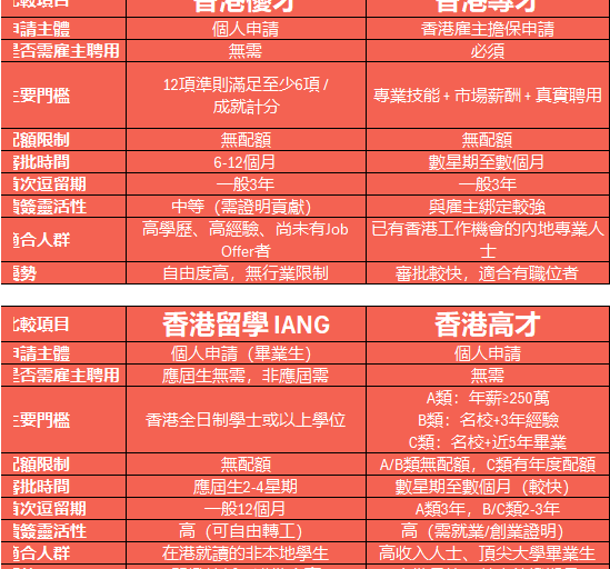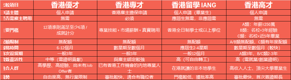 香港作為國際金融及創新中心,推出多項人才入境計劃,吸引全球及內地優秀人才來港發展。以下為四大主流途徑的結構化說明,包括 香港優才計劃(優秀人才入境計劃)、香港專才計劃(輸入內地人才計劃)、香港留學 IANG(非本地畢業生留港/回港就業安排) 及 香港高才通計劃(高端人才通行證計劃)。